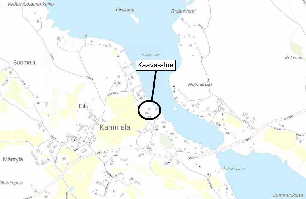 Suunnittelualue sijaitsee Uudenkaupungin Kammelassa Hujun-rauman länsirannalla noin 15 km Uudenkaupungin keskustasta luo-teeseen ja noin 10 km Pyhärannan keskustasta länteen. Suunnit-telualueelle on kiinteä tieyhteys Pyhärannantien ja Lyökintien kautta.