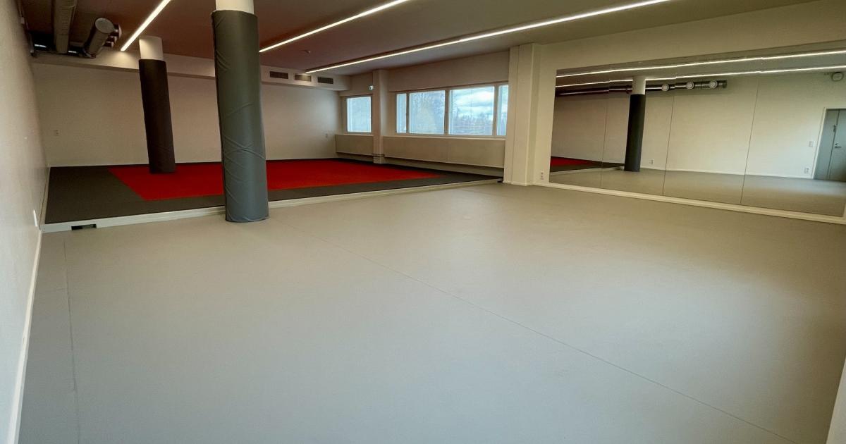 monitoimisalissa peilit seinällä sekä takana tatamilattia sekä ikkunat