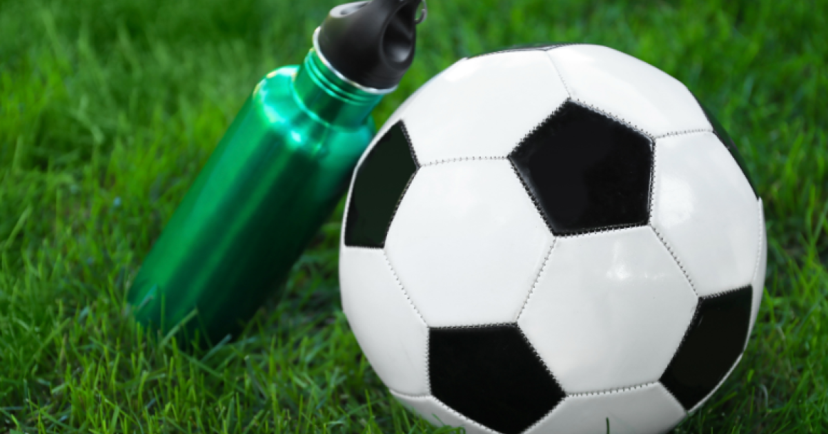 Jalkapallo ja juomapullo tekonurmella.