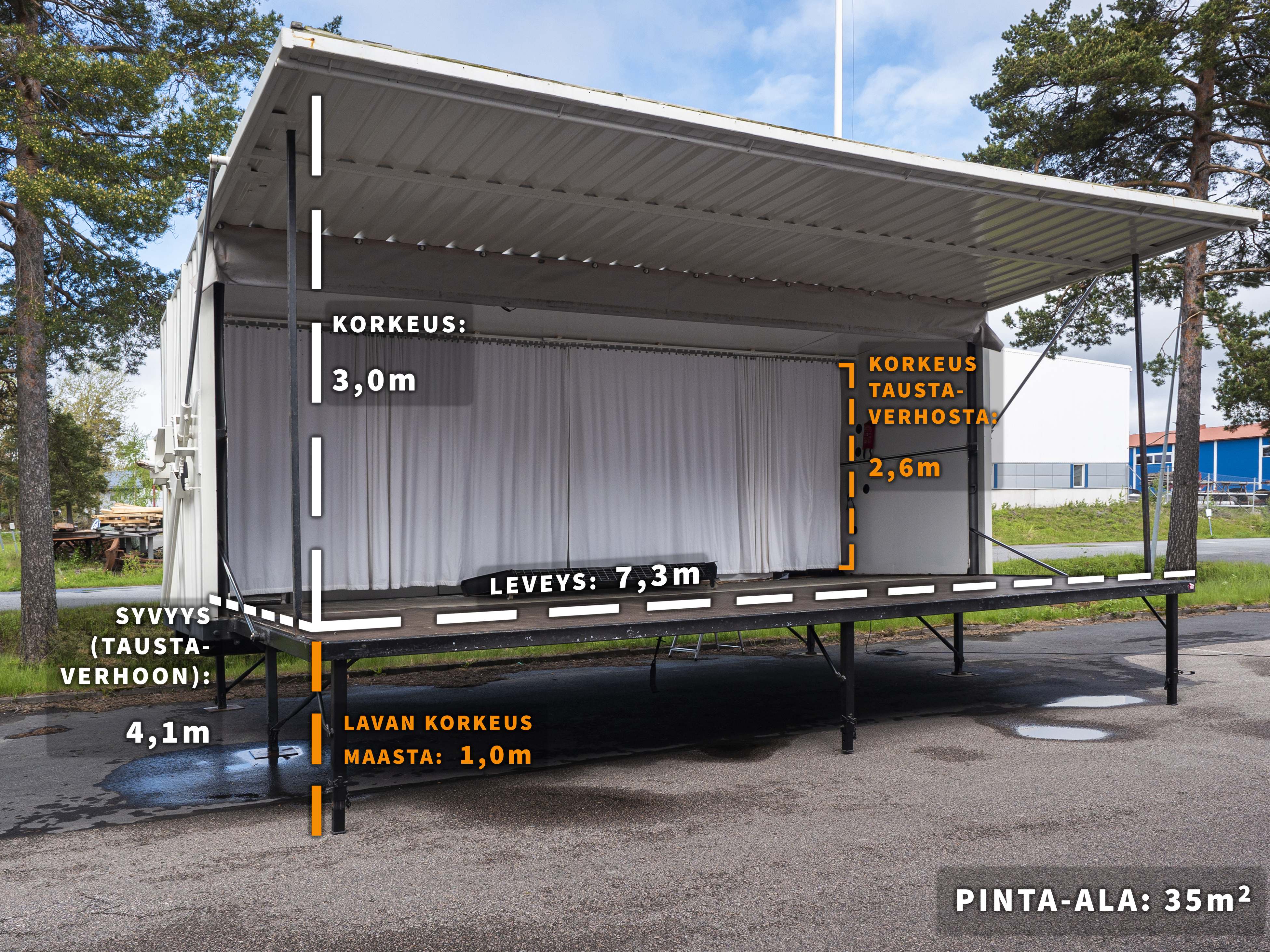 Korkeus lattiasta: 3 metriä etuosasta / 2,6 metriä taustaverhosta