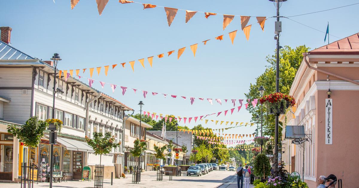 Alinenkatu kesällä 2023, värikkäät viirit auringossa kylpevän kadun yllä.