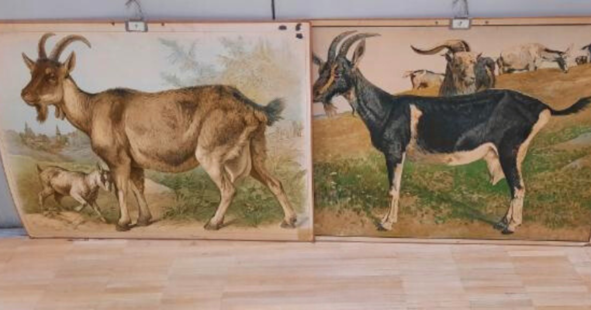 Kuva kahdesta vanhasta vuohiaiheisesta opetustaulusta.