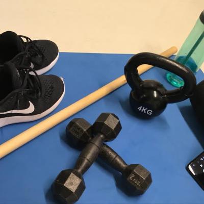 jumppatossut ja -keppi, käsipainot, kahvakuula, vesipullo